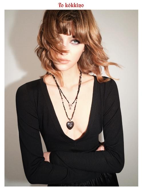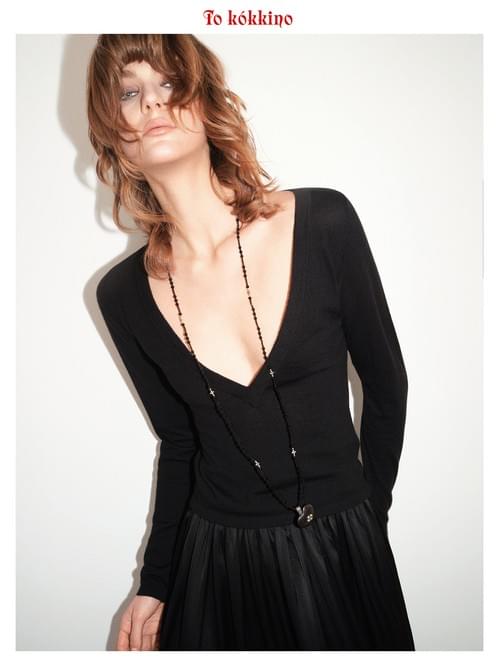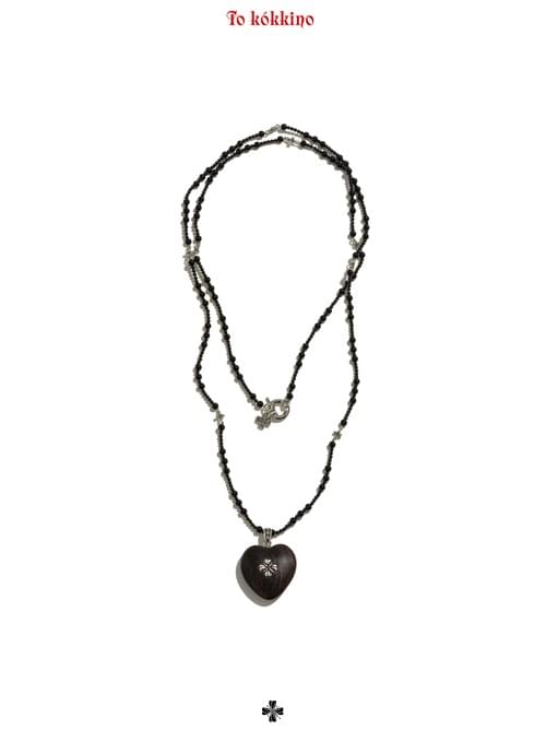 A dark-toned long necklace strung with agate and sandalwood, featuring a restrained structure. The brand's iconic logo is interspersed as an accent, and the chain length is adjustable, infusing the overall look with a sense of calm and strength.