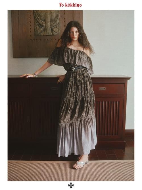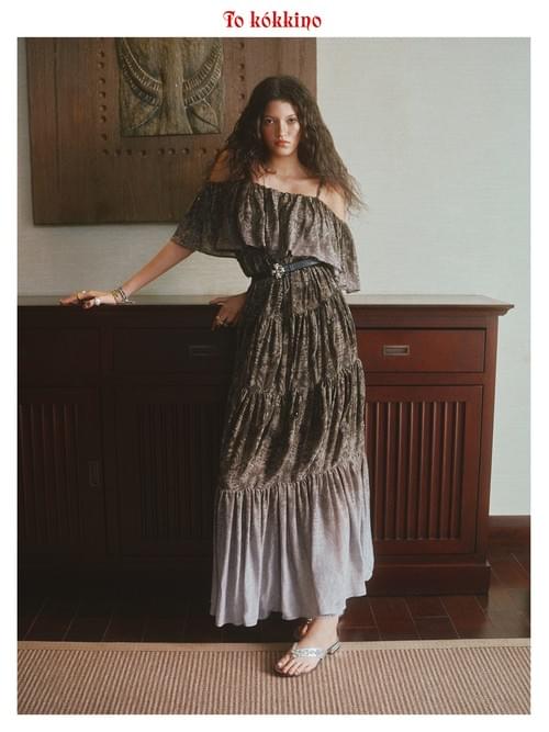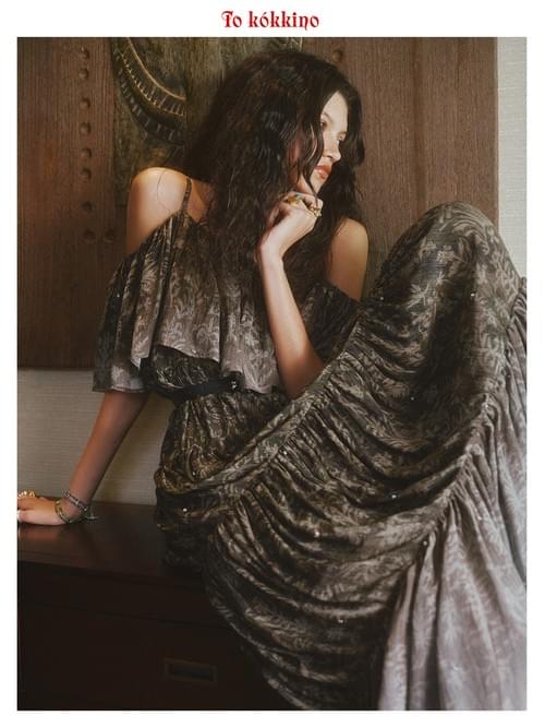 • Off-the-shoulder silhouette with a large ruffled hem design. Clean lines meet a flowing skirt, accented with a waist-cinching belt.