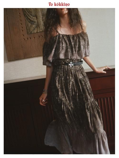 tokokkino "Deep Sea Falling Leaves" Crystal Pearl Off-the-Shoulder Dress