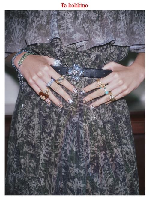 • Hand-sewn random natural pearls and gold-silver reflective metal accessories.