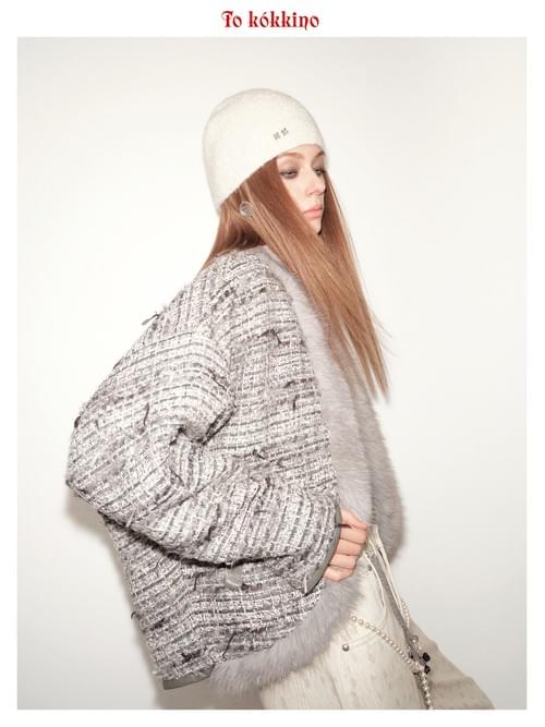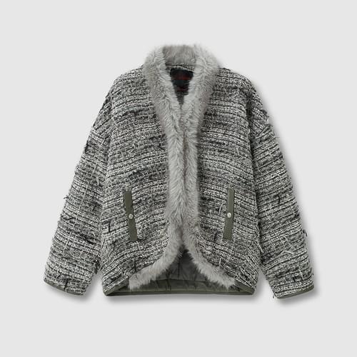 The heathered grey-pink tweed presents delicate layers in the light, and the curved edges prevent the coat from looking bulky. The eco-friendly faux fur details and adjustable hem lend the piece a touch of wild dynamism while retaining its gentle charm.