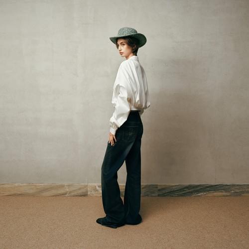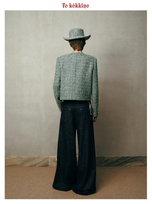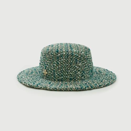 Made from custom green textured fabric, the flat brim features irregular details that break away from the traditional formal look of a top hat.