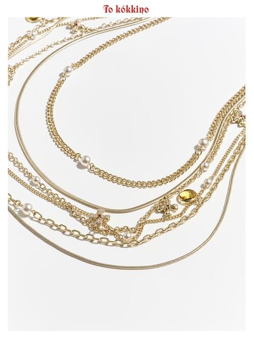 Layered chains are interwoven with pearls and gemstone accents, while the addition of glass elements makes the light and shadow more dynamic.