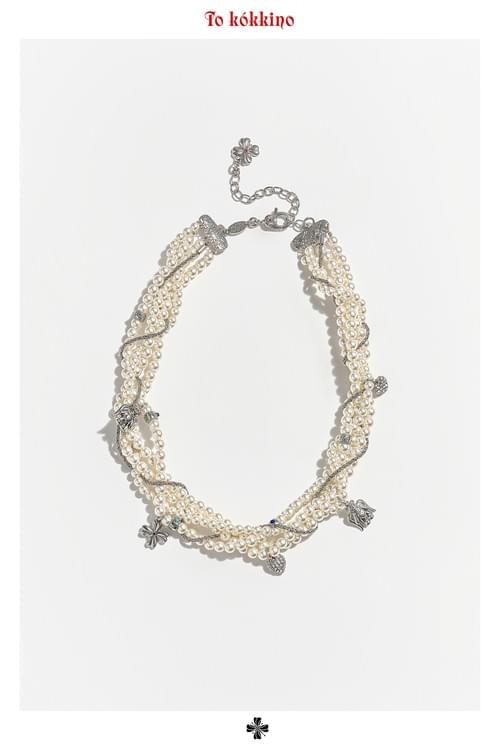 Pearls interwoven with teddy bear pendants create a dynamic structure through a multi-layered wrap design.