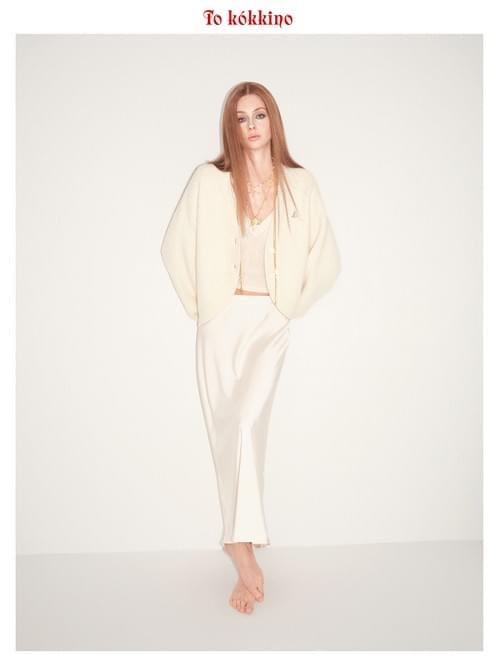 The off-white hue is clean and understated. The curved hem softens the silhouette, while the stand-up collar elongates the neck line. Adorned with tokokkino's signature heart brooch on the chest, it adds a subtle touch of personality to the minimalist shape.