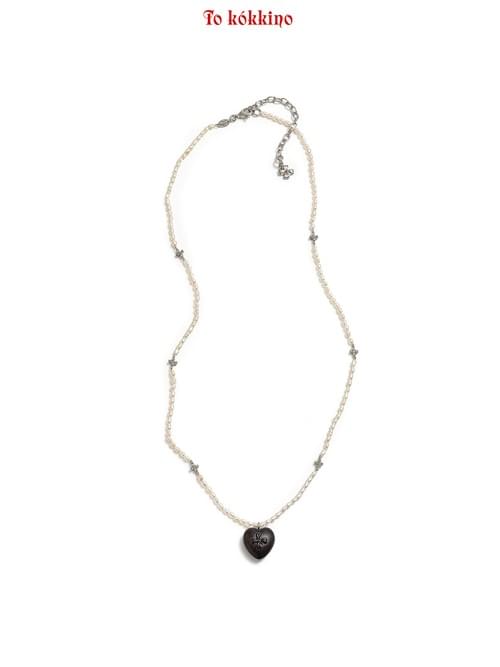 Pearl and Wood Heart Necklace: Irregular natural fine pearls are strung together to form the chain, with a bow flower clasp inserted in the middle to intentionally break the rhythm. A heart-shaped piece of purple sandalwood serves as the pendant. The gentle texture of the wood and the luster of the pearls are juxtaposed, leaving a hint of untamed vitality