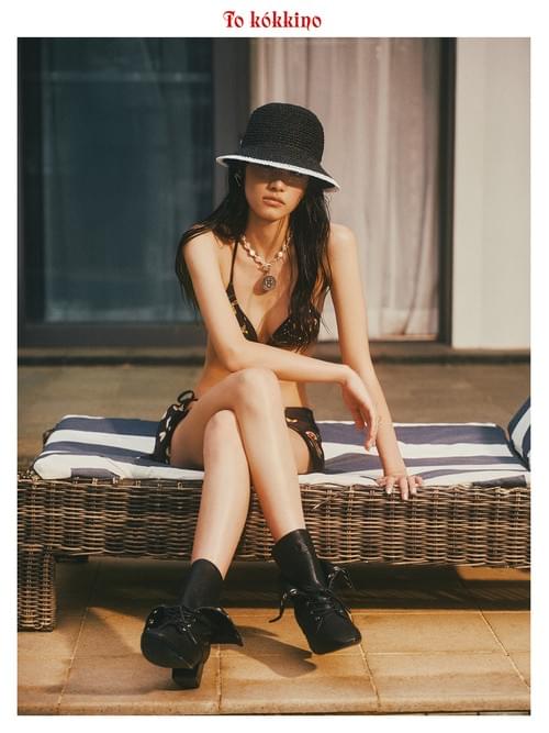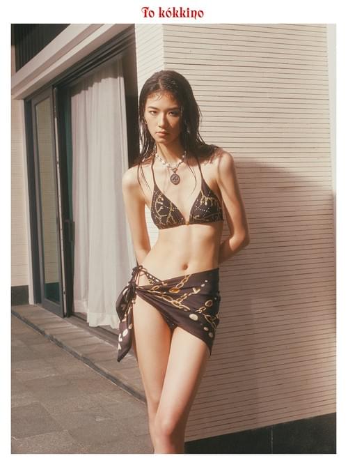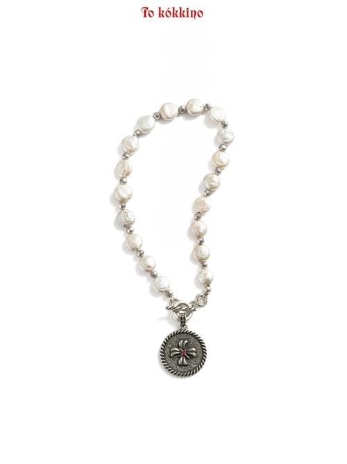 Irregular natural pearls, each one unique, are strung into a short chain. At the center hangs a disc with a rugged carved texture, inlaid with rubies—blending vintage charm with a touch of edge. Worn close to the collarbone, the natural textures of the pearls stand out beautifully.