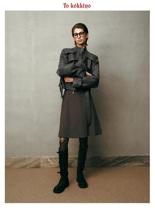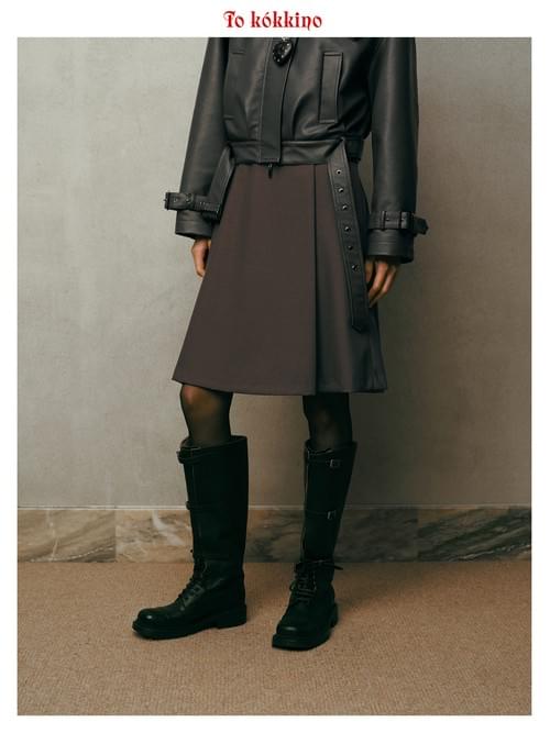 Selected high-weight worsted wool fabric keeps the skirt in shape without losing drape. The knee-length design flatters the leg line while enhancing versatility in daily styling.